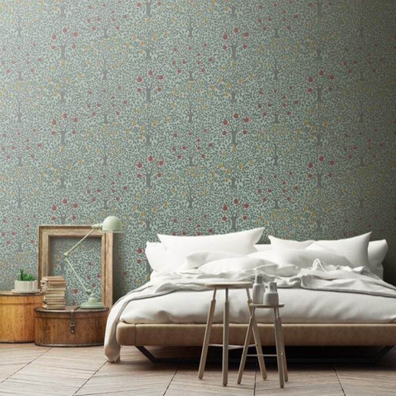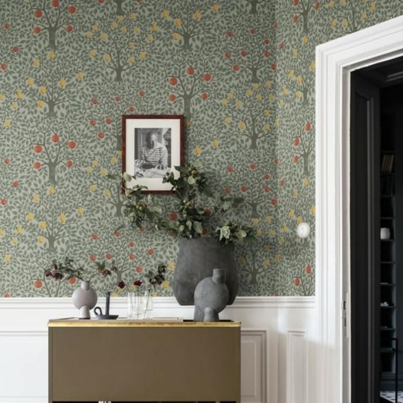 たわわに赤いリンゴと黄色の洋ナシ林が楽しい壁紙"Pomona"。5色展開のうちのグリーン。スウェーデンのダーラナとスコーネ地域の伝統から触発されているそうです。壁紙トップデザイナーのひとりHanna Wendelbo ハンナ・ヴェンデルボさんの花柄の力作であり、本国でも高い評価を得たコレクション”Apelviken”より。