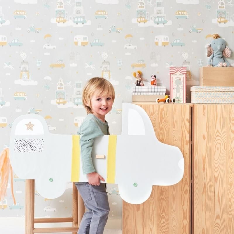 壁紙「Above The Clouds」はタイトル通り雲の上の夢の街を描いています。子供部屋に貼れば、楽しいイラストの一つひとつに惹きつけられることでしょう。2色展開のうちのソフト・グレー。※画像よりもっと優しい色です。年齢問わず胸キュン間違いなし。スウェーデンの壁紙メーカー、マイヴィラン社の夢と魔法のコレクション「Wish Upon Your Dreams」より。