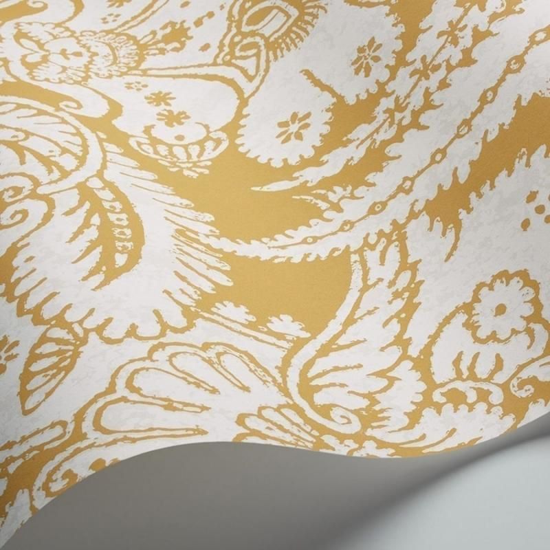 Cole&Son(コール・アンド・サン)社の歴史的なアーカイブの中から、シダの葉とエキゾチックなフルーツを模様化したのが壁紙「Chatterton」(チャタートン)。17歳で早世した英国の詩人から名前を取っています。伝統的でありながらモダンなカラーを採用して現代生活に似合うファッショナブルな一枚です。幅の広い壁紙(68.5cm)は、6色展開のうちのフレンチ・イエロー。色の付いた地の面にクールなチョーク・ホワイトのような色合いで印刷されています。セレブやボヘミアンたちが集うロンドンの老舗プライベートメンバークラブにちなんで名付けられた、グラマラスなダマスク柄のコレクション「Albemarle」(アルベマーレ)。