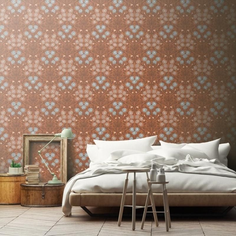 「壁紙「Bellis」は、花が鏡のような柄で構成されている古典的なメダリオン柄として設計されています。このようなパターンを描くのが大好きです!」(ハンナさん談)。6色展開のうちのブルーとピンクの小さな花にレッド・オレンジ。花柄のトップデザイナー、Hanna Wendelbo(ハンナ・ヴェンデルボ)さんのmidbec(ミッドベック)社5作目になる最新作が「Ekbacka」コレクション。6つの柄で構成され、すべてが調和するように異なった柄でも組み合わせが楽しくなるようにデザインされています。