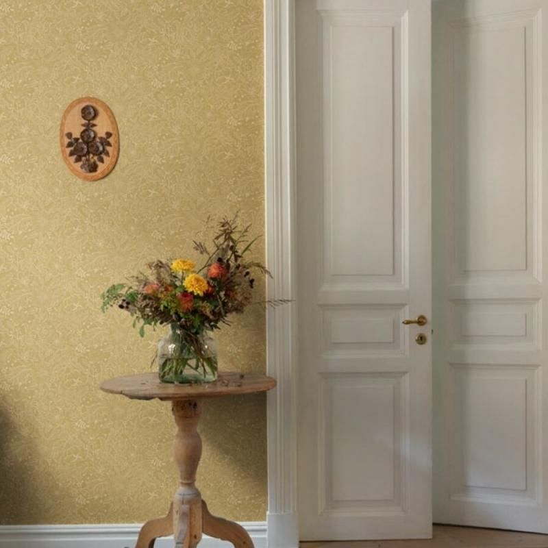 単色の輪郭線で花と葉を描いた壁紙「Wilma」(ヴィルマ)。5色展開のうちのライト・ブラウンの背景にライト・イエローの輪郭。花柄のトップデザイナーHanna Wendelbo(ハンナ・ヴェンデルボ)が手がけた、花や葉で満たされた牧草地をイメージした、魅力的で心のこもったmidbecミッドベック社のÄngås(エングオース)・コレクションより。