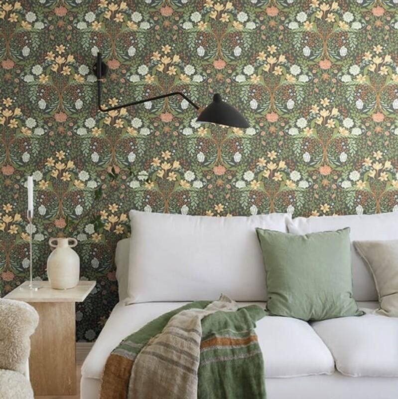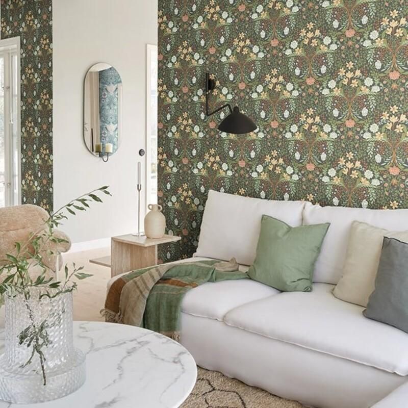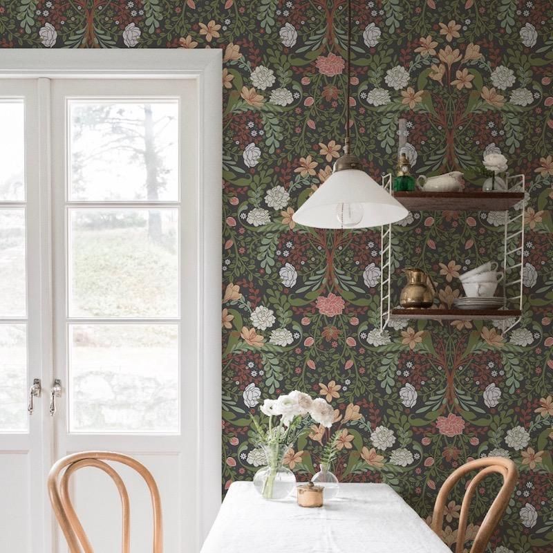 美しいメダリオン模様の花柄の壁紙「Frösö」(フレーセ)。7色展開のうちのブラウンを背景にホワイト、アプリコット・イエローの花。デザイナーのBjörn Nilsson(ビョルン・ニルソン)によってダーラナ地方にあるこの美しい場所からイメージされた花柄コレクション「Sunnanö」スンナノより。居心地の良い雰囲気を作り出し、その素敵な配色は家に華やかさをプラスしてくれることでしょう。